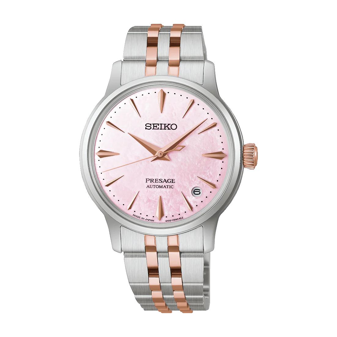 Con una cassa compatta da 34 mm, il quadrante rosa a gradazione verticale evoca la sensazione di un cocktail rinfrescante ammirando i ciliegi in fiore. È il primo modello della collezione Cocktail Time a presentare un quadrante in madreperla, valorizzato da bracciale bicolore e dettagli color oro rosa su corona, lancette e indici, per un’estetica delicata ed elegante.