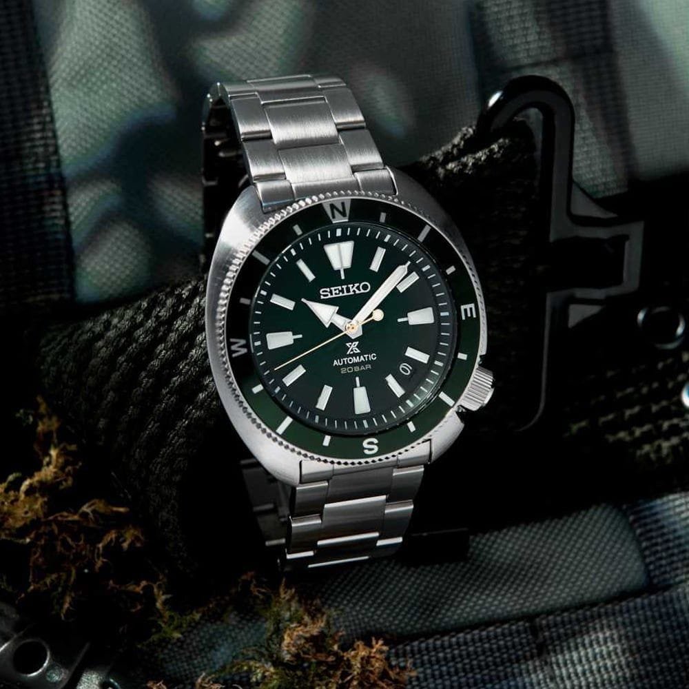 L’orologio Seiko Prospex Tortoise Land SRPH15K1 presenta una cassa in acciaio inossidabile diametro 42.4 mm e uno spessore di 11,72 mm. Il movimento è automatico 4R35 con capacità di carica manuale e riserva di carica di circa 41 ore. Monta un vetro zaffiro che protegge il quadrante verde è trattato con LumiBrite su lancette, indici e lunetta. Bracciale in acciaio. Resistenza all’acqua 200 metri / 20 bar. Questa forma di orologio è conosciuta come “Tortoise/tartaruga”, ispirata alla forma popolare dell’orologio subacqueo soprannominato dai fan di Seiko per via del suo profilo a forma di conchiglia.